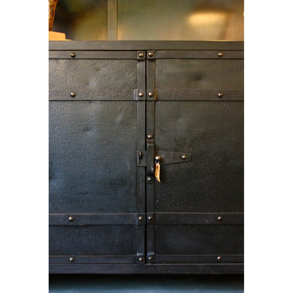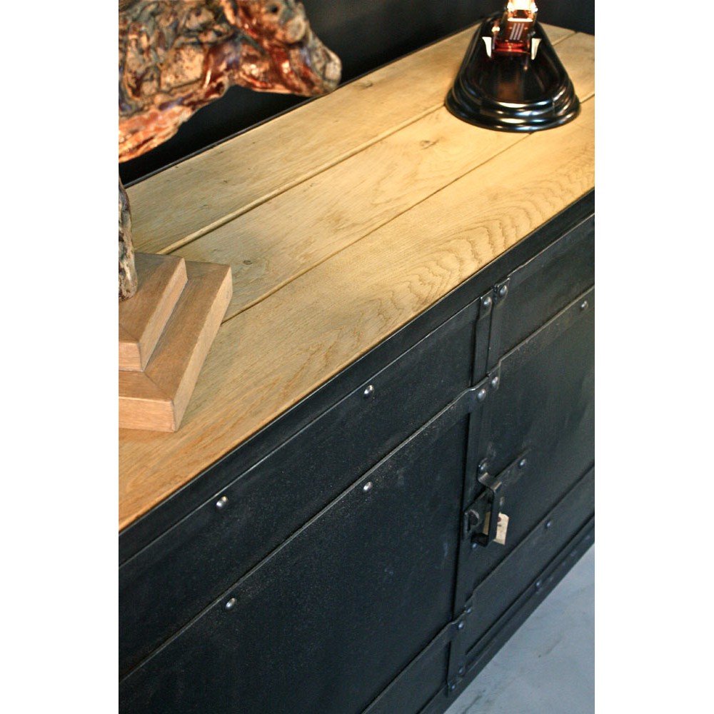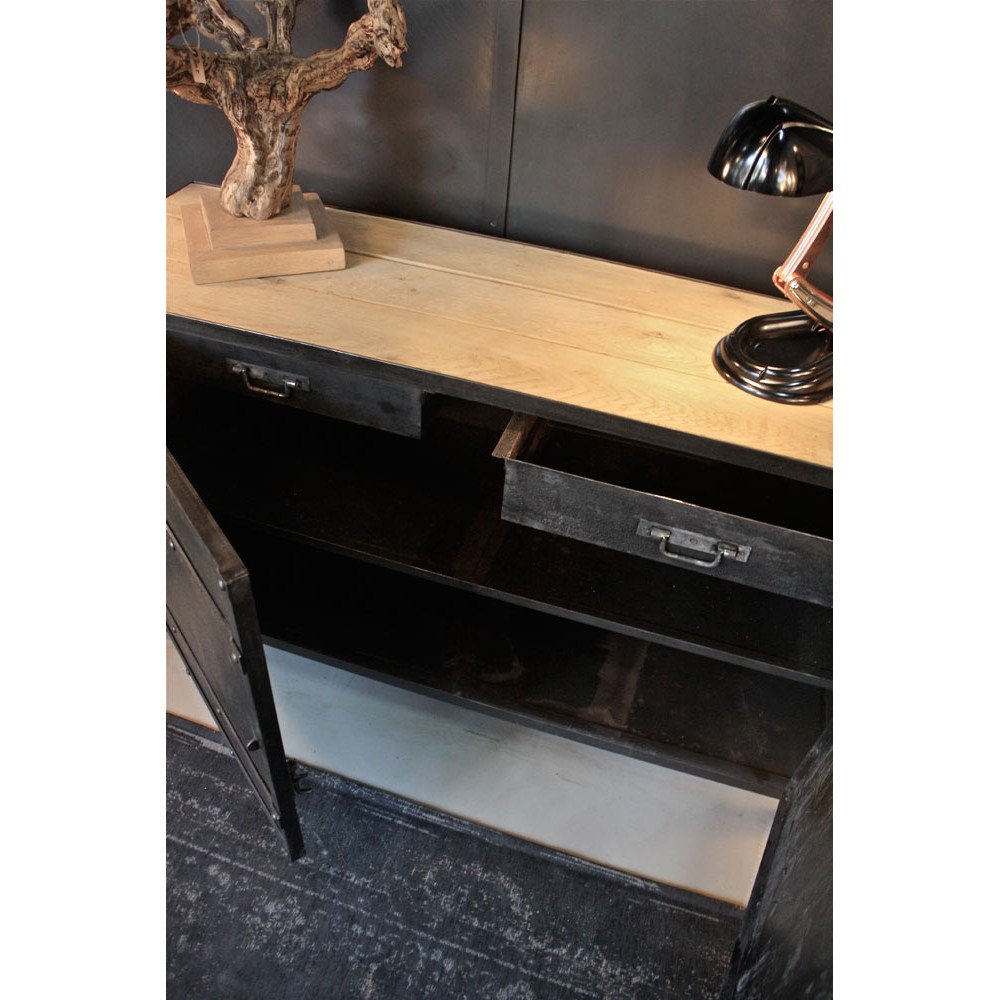 Petit meuble industriel réalisé à partir de métal ancien, belle patine avec effet grenaillé, plateau en planches de chêne recyclé finition naturel, 2 portes, 1 étagère centrale, 2 tiroirs en partie haute, fermeture par loquet.